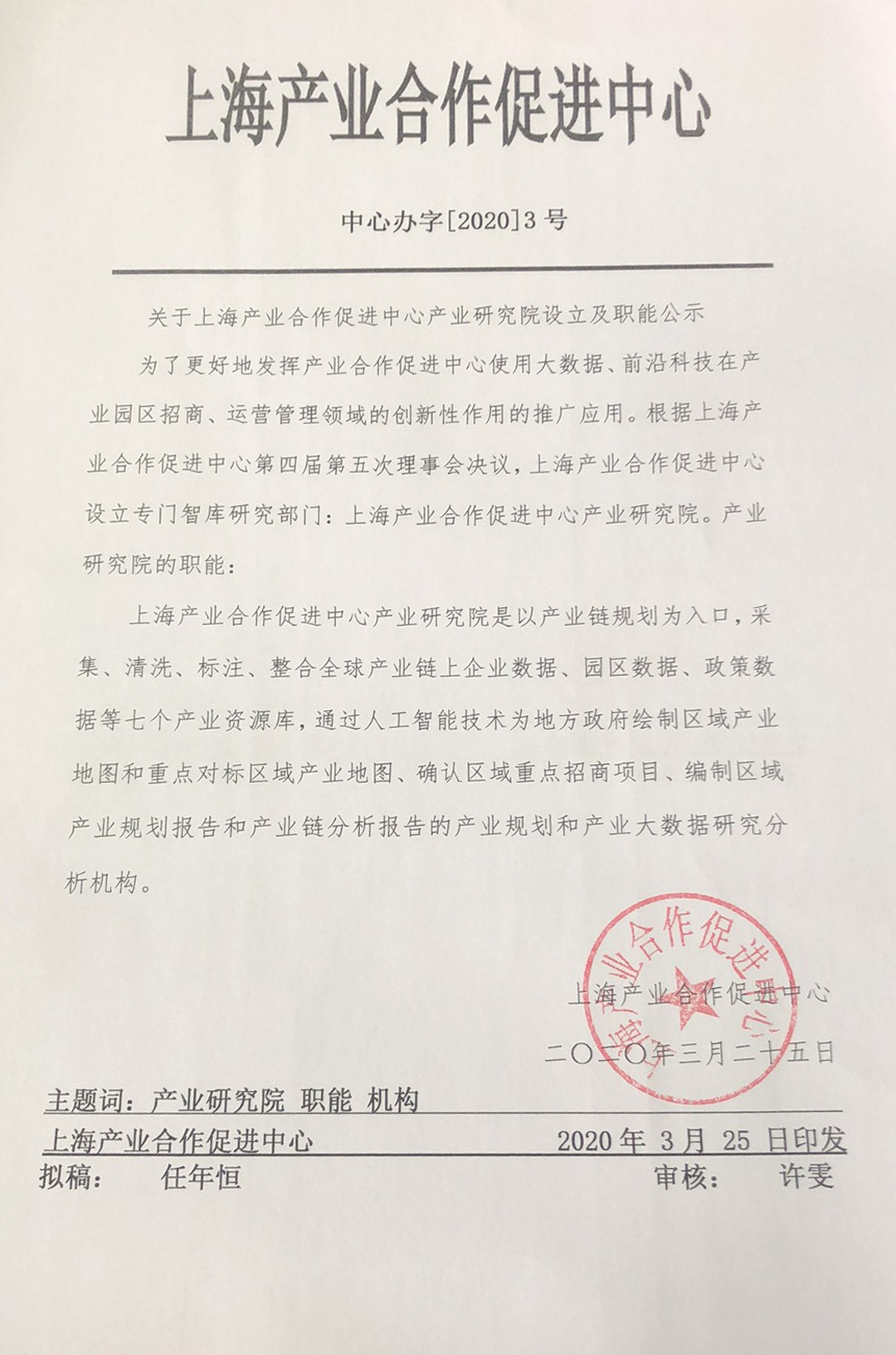上海产业合作促进中心产业研究院成立及院长聘用公示